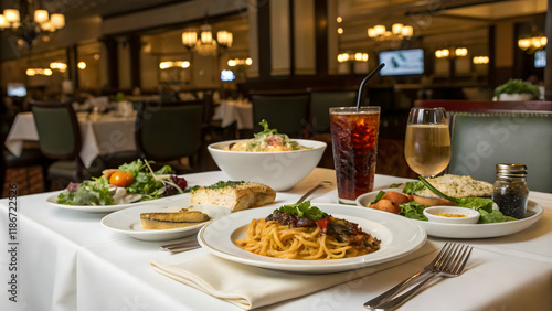 Elegant Dining Table Set in Restaurant with Various Dishes and Drinks
