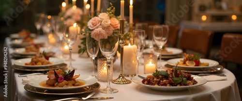 Elegant Dinner Party A Gourmet Table Set with Fine Dining Ware and Delectable Dishes