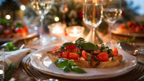 Elegant Dinner Setting with Bruschetta, Wine Glasses, and Candles for a Sophisticated Celebration