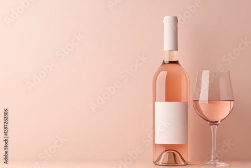 Elegant display of a wine bottle and glass resting on a smooth surface with a soft pastel background during a calm afternoon