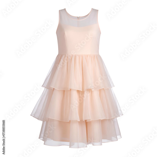 Elegant dress features a sleeveless design with a sheer neckline and a cascading, tiered skirt.