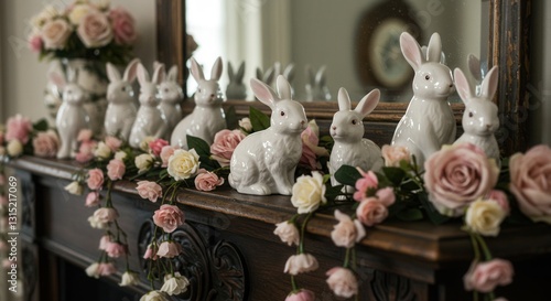 Elegant Easter Decor Ceramic Rabbits and Pink Roses on Fireplace Mantel