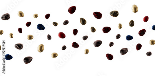 Elegant Easter egg design on white. Featuring gold, red, blue, and patterned eggs. Perfect for holiday design, spring, d