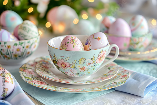 Elegant Easter tea setting with floral-painted eggs and fine china
