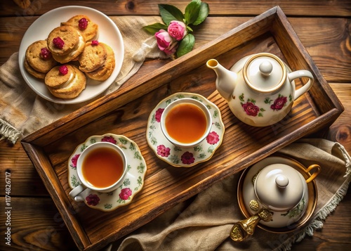 Elegant English Afternoon Tea: Vintage China Tea Set, Wooden Tray, Flat Lay