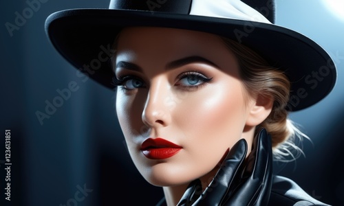 Elegant femme fatale with hat and red lips in dramatic lighting