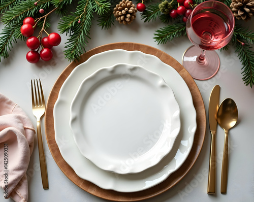 Elegant Festive Holiday Table Setting with White Plates Gold Cutlery and Natural Decorations Awaiting Guests for a Special Celebration