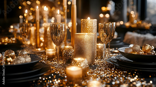 Elegant Festive Table Setting Glows with Gold Candles and Ornaments for a Celebration Dinner