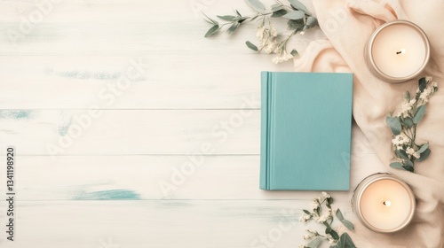 Elegant Flat Lay of Book, Candles, and Greenery on Wooden Surface
