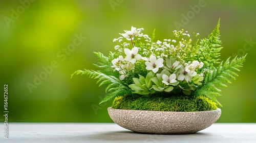 Elegant floral arrangement in stone bowl on green background