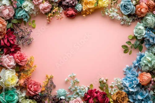 Elegant floral border with vibrant flowers lush greenery on light background. Ideal for decorative designs wedding invitations or romantic designs valentines day, mother's day, women's day