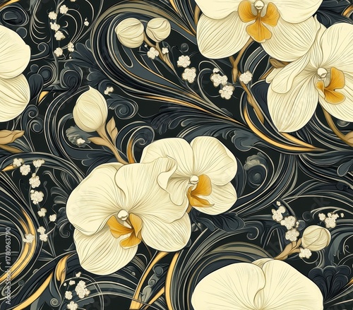 Elegant Floral Pattern Featuring White Orchids and Delicate Blossoms on Dark Background with Swirling Lines and Natural Elements for Design Projects