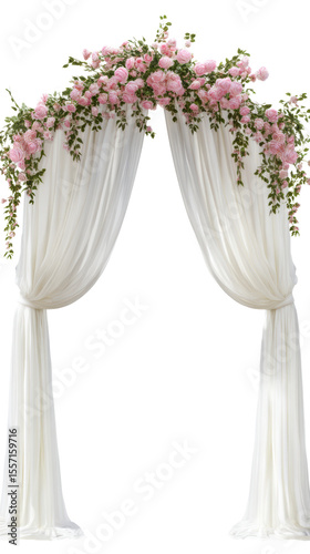 Elegant floral wedding arch with white drapes.