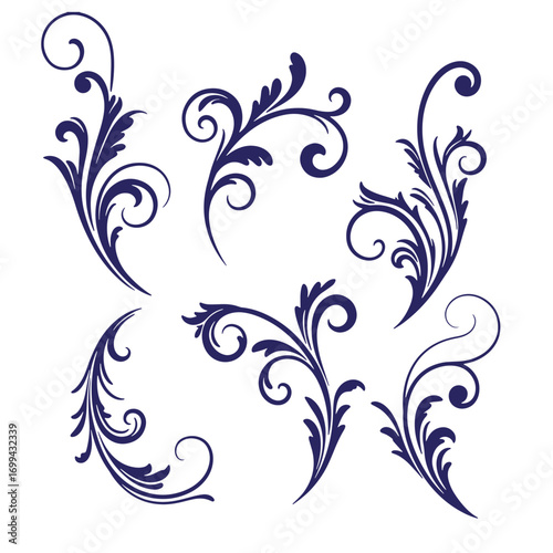 Elegant flourish design elements collection in navy blue color with detailed decorative swirls