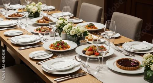 Elegant formal dinner party table setting with gourmet food and floral arrangements