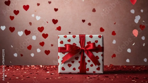 "Elegant Gift Box with Romantic Decorations on Red Background".
