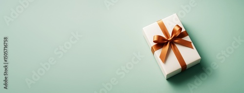 Elegant gift box with satin ribbon on pastel green background, minimal festive concept with copy space for advertising and promotional design template.