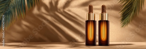 Elegant Glass Bottles of Serum Placed on a Wooden Surface With Tropical Shadows, Highlighting Luxury and Natural Beauty