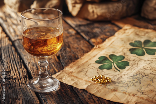 Elegant glass of Irish whiskey resting on a rustic wooden table with shamrock map and gold coins for celebrating St. Patrick's Day festivities