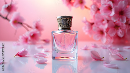 Elegant glass perfume bottle surrounded by soft pink floral petals and branches aromatic fragrance