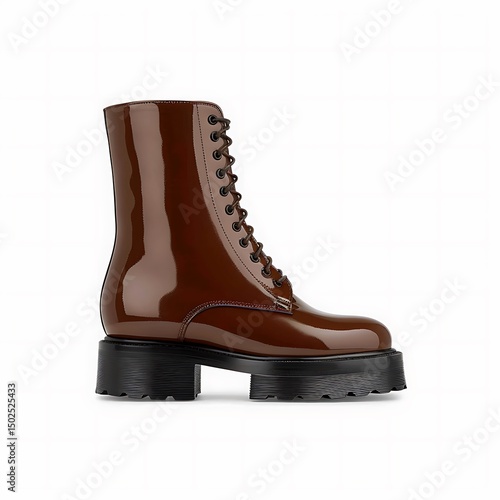 Elegant glossy brown leather ankle boot with chunky black platform sole