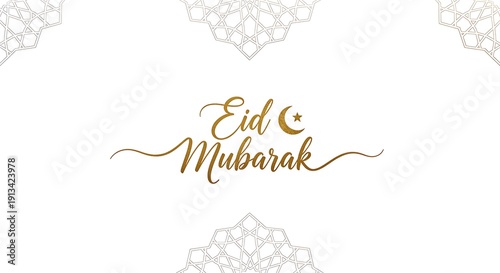 Elegant gold Eid Mubarak text on white Islamic pattern background