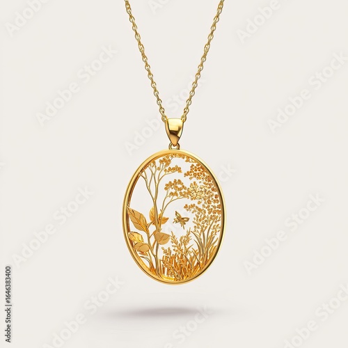 Elegant gold necklace with an oval pendant featuring an intricate nature-inspired design