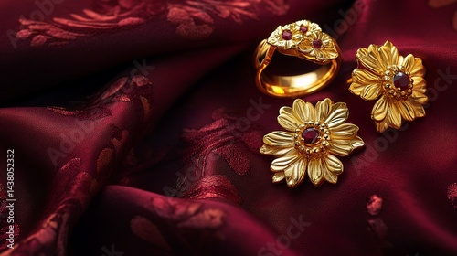 Elegant Gold Ruby Flower Jewelry Ring Earrings Set Luxury Fashion Accessory Design Red Background Detailed Image High Resolution Jewelery rich shiny