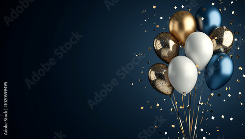 Elegant Gold, Silver, and Blue Balloons with Sparkling Confetti on Dark Background for Celebrations
