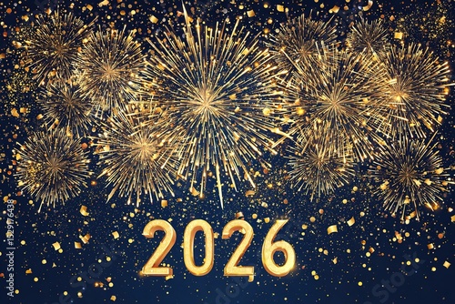 Elegant golden fireworks New Year background with 3D “2026” over navy sky