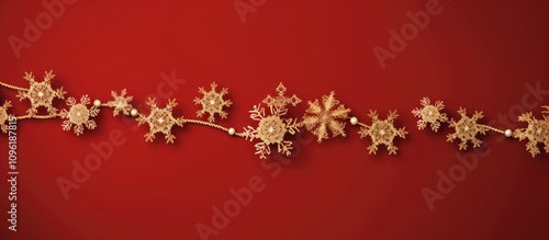 Elegant golden snowflake garland on rich red background perfect for minimalist Christmas greeting cards and festive decorations