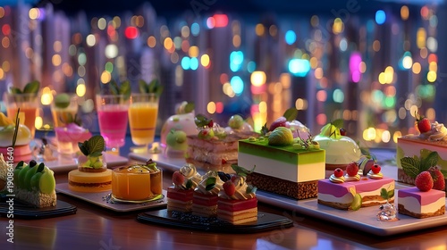 Elegant Gourmet Desserts and Drinks with City Lights