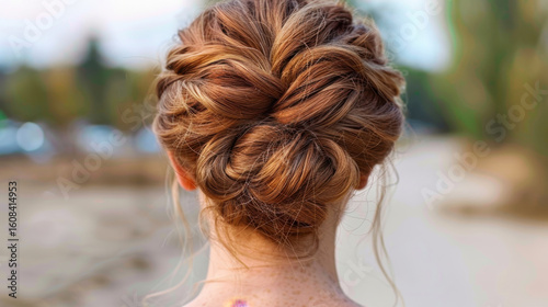 Elegant hair twisted into figure eight bun, showcasing beautiful hairstyle against blurred outdoor background. warm tones of hair complement serene atmosphere