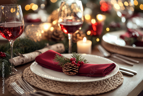 Elegant holiday dinner table setting with wine glasses, pinecones and festive lights creating a warm and inviting atmosphere for celebration