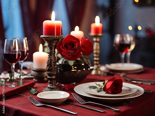 Elegant holiday table setting with beautiful flowers, candles and luxurious tableware.