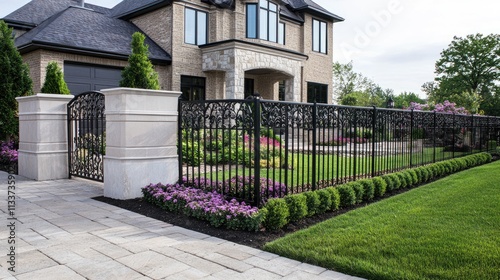 Elegant house exterior with lush garden and decorative fence design
