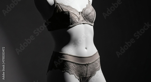 Elegant Lace Lingerie Set on Mannequin in Studio Lighting, Bra and Panties, Dark Background
