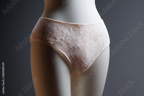 Elegant lace panty on sleek mannequin featuring intricate stitching in soft, bright studio lighting.
