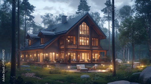 Elegant log cabin home nestled within a tranquil forest.