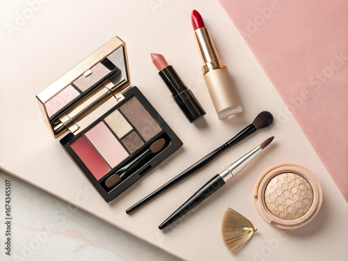 Elegant makeup collection featuring eyeshadow palette lipsticks and brush