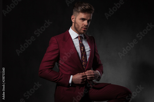 elegant man buttoning his red suit while sitting