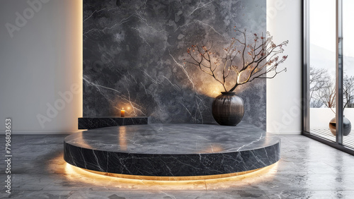 Elegant Marble Stage with Decorative Vase and Warm Accent Lighting