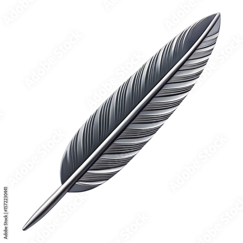 Elegant metallic quill feather with detailed barbs isolated on transparent background