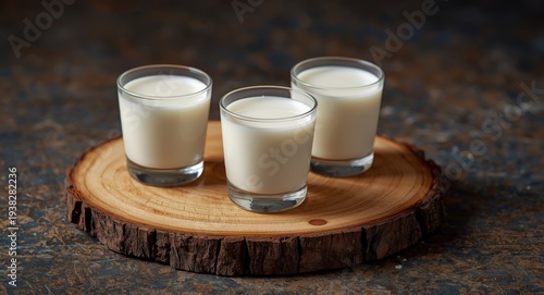 Elegant milk glasses resting on a handcrafted old wooden slab
