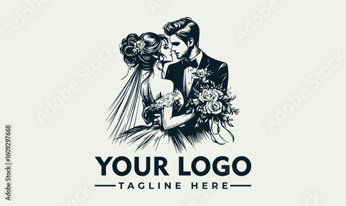 Elegant monochrome illustration of a bride and groom embracing, showcasing a romantic wedding logo design.