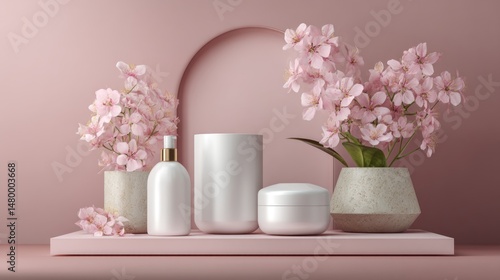 Elegant Pink Beauty Product Display with Cherry Blossoms