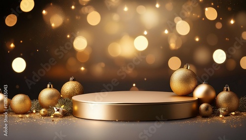 elegant podium with golden baubles and festive bokeh lights