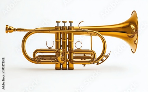 elegant polished brass cornet with three valves, mouthpiece, and reflective bell on a clean white background, radiating pristine sophistication and calm