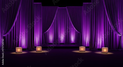 Elegant purple draped stage with uplighting and lanterns