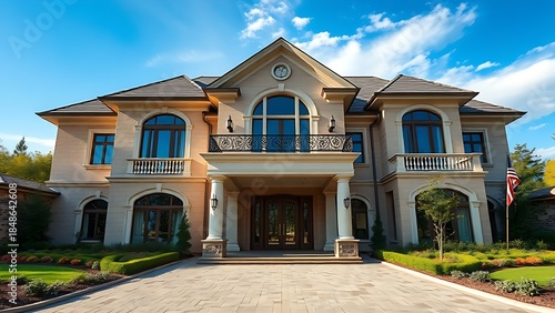 Elegant residence entrance with architectural details under a clear blue sky, exuding luxury.